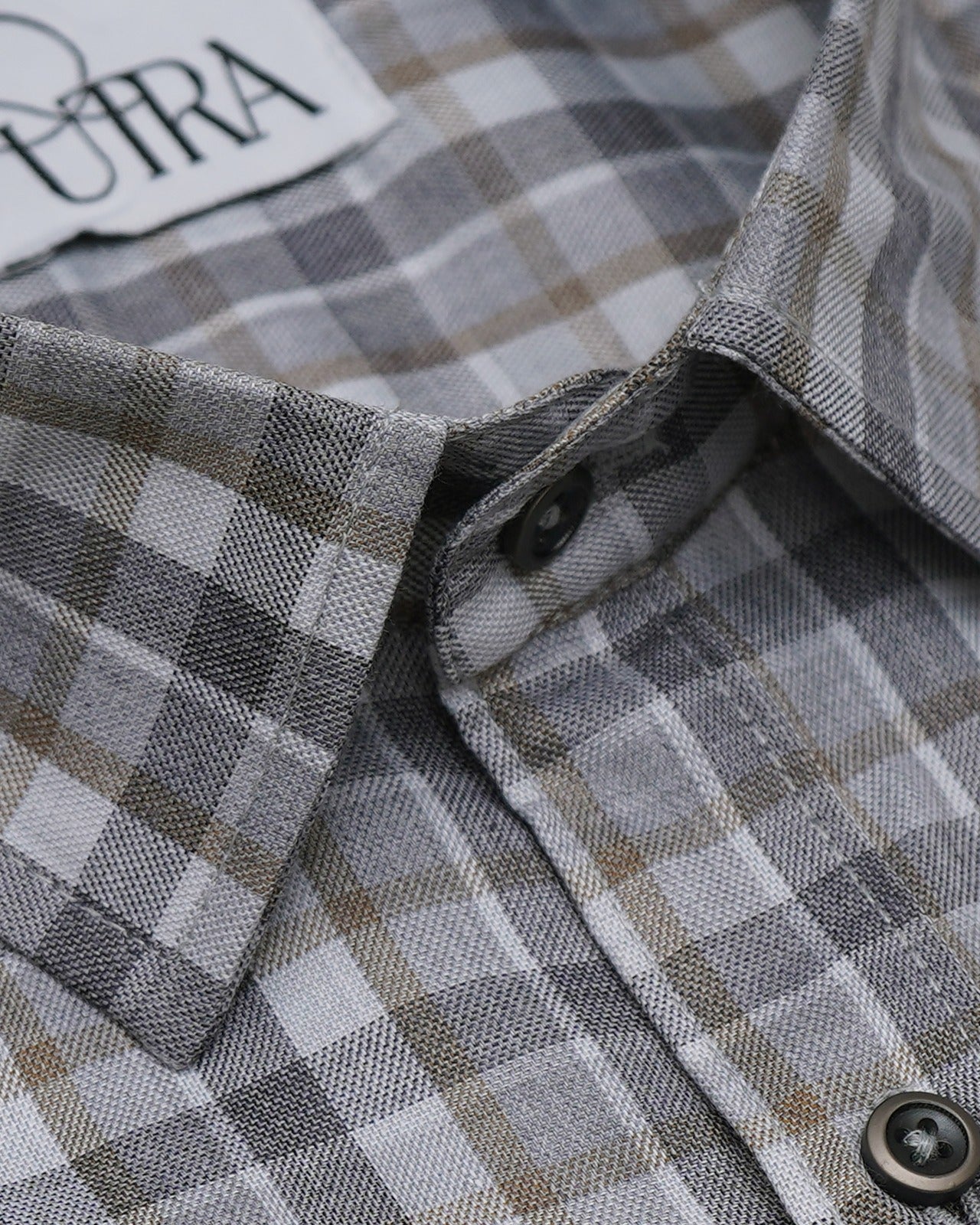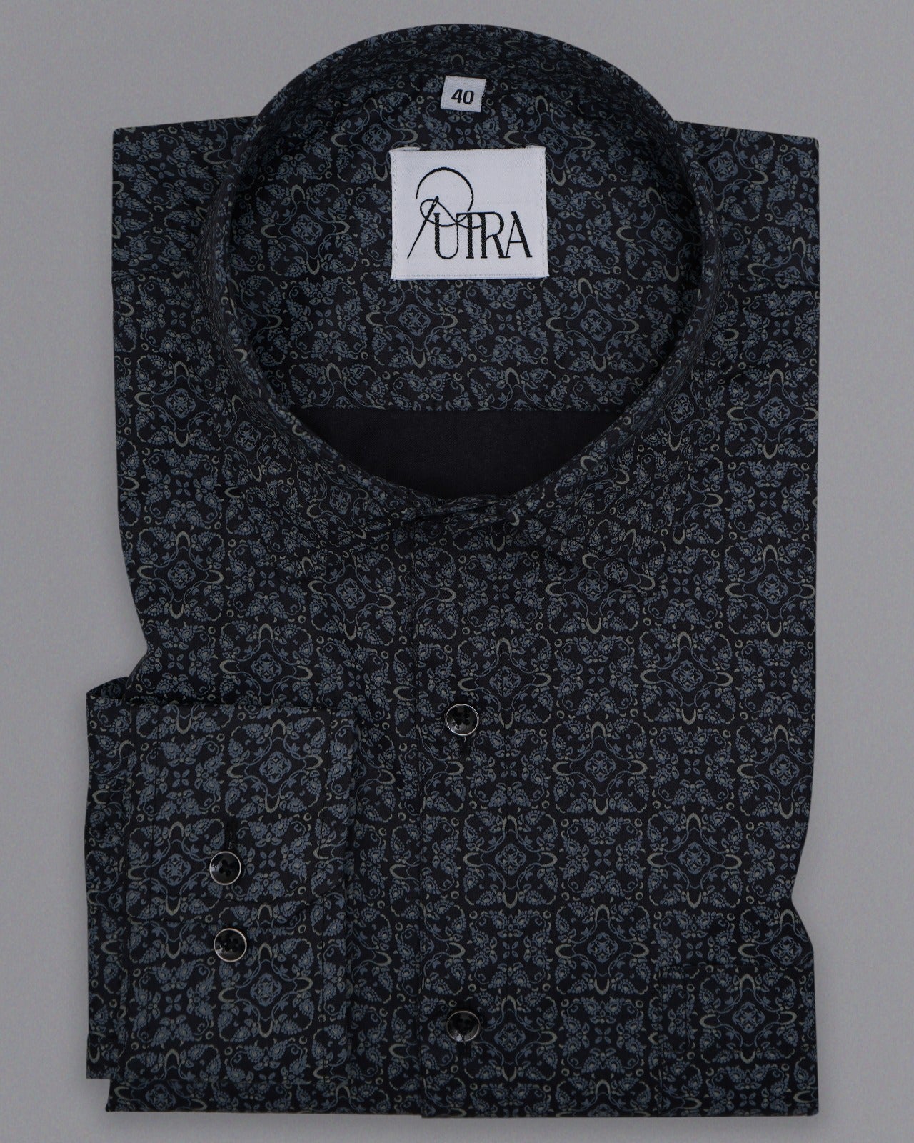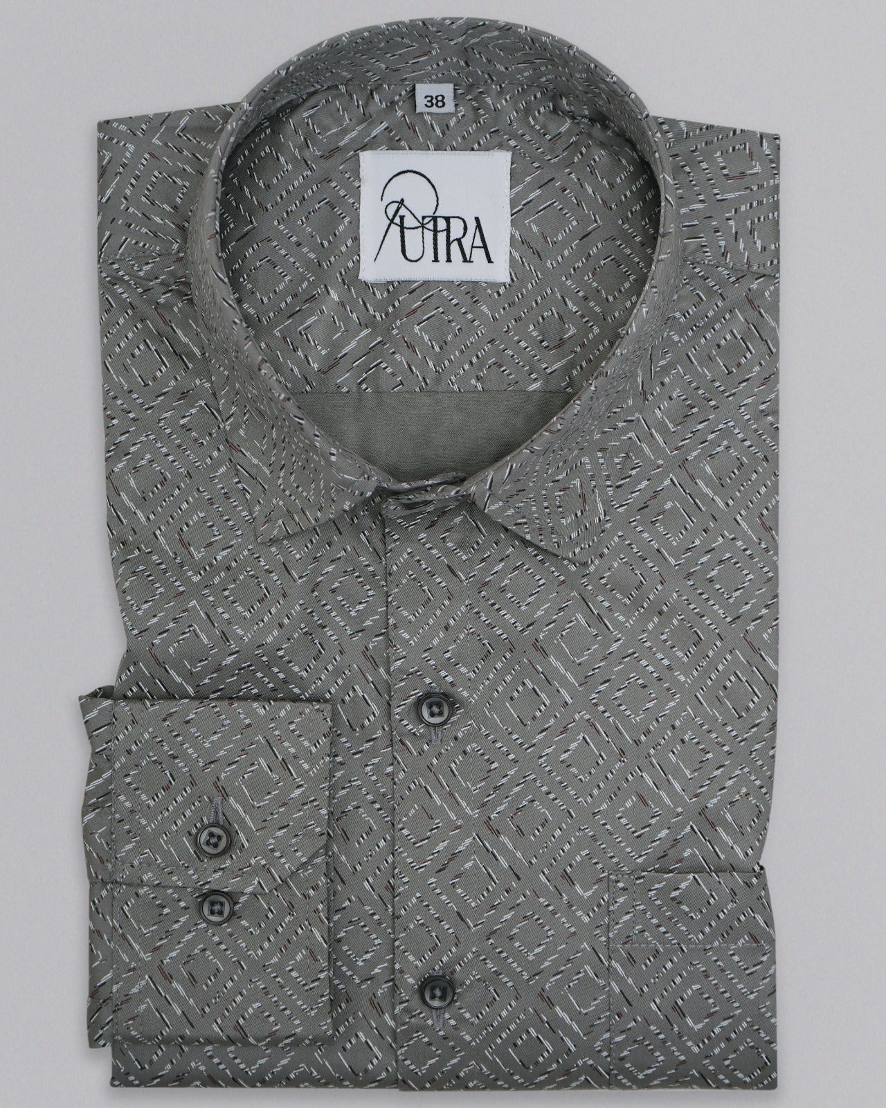 Sophisticated Grey Geometric Cotton Shirt with Black Accents