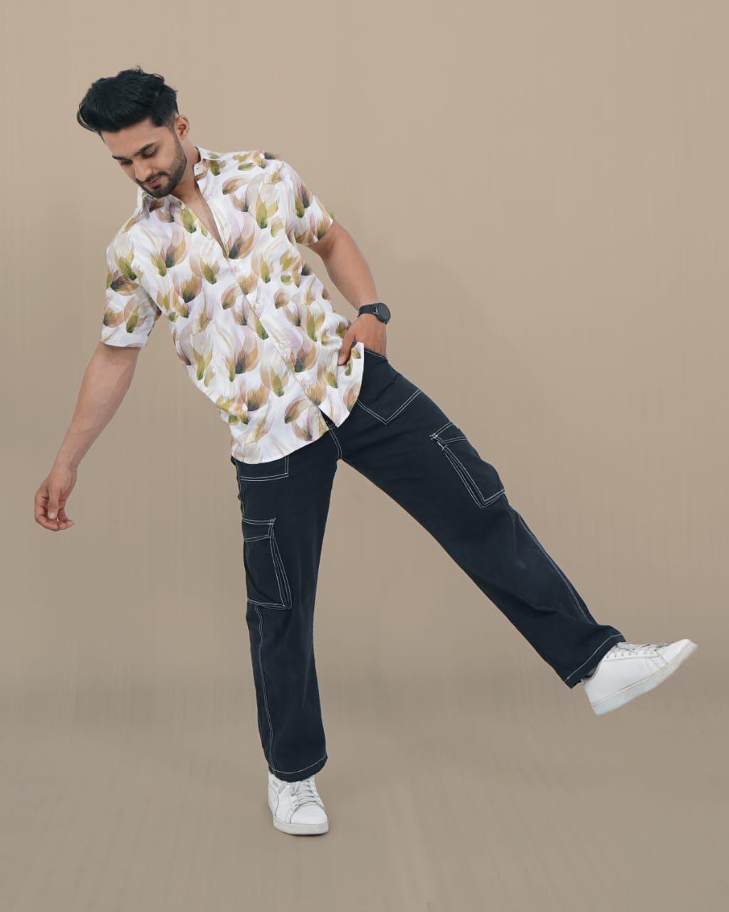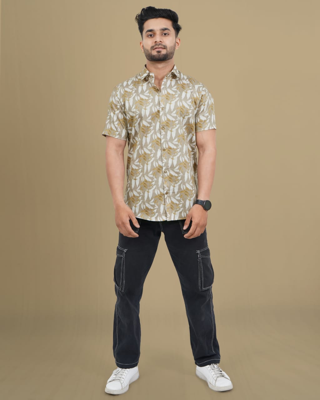 Men Sand Colour Slim Fit Printed Half Sleeves Casual Shirt