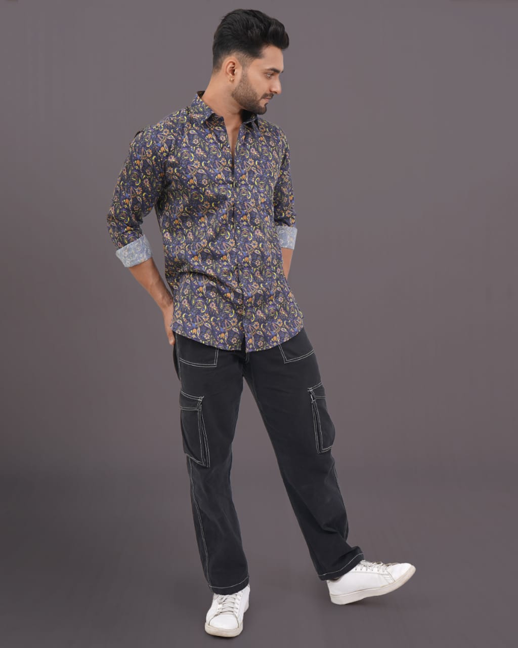 White Floral Shirt with Blue and Grey Accents