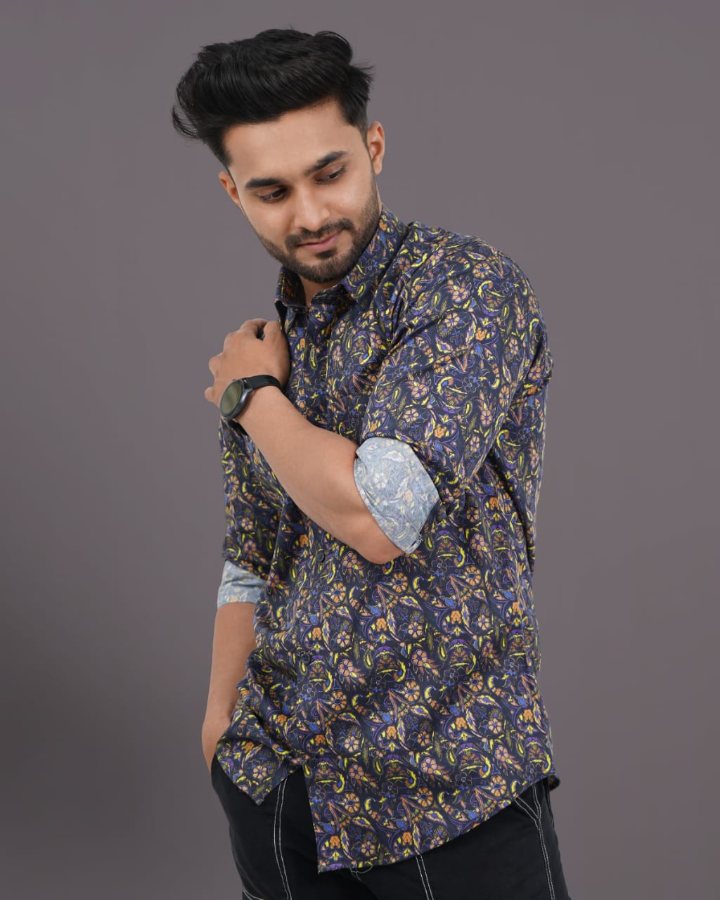 Navy Blue Shirt with Small Leaf Print