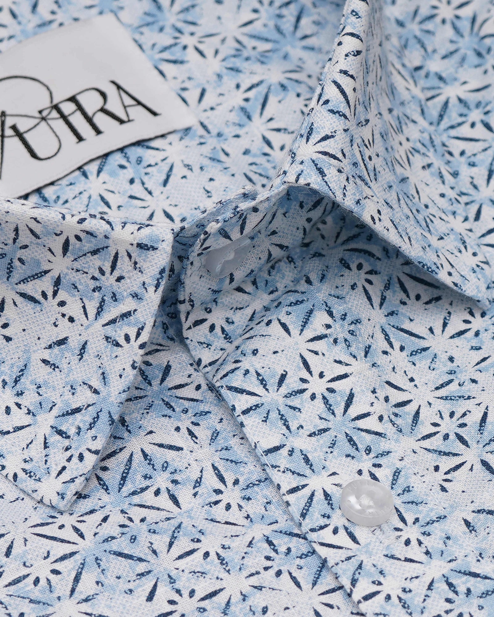 Men's White and Blue Geometric Print Slub Shirt