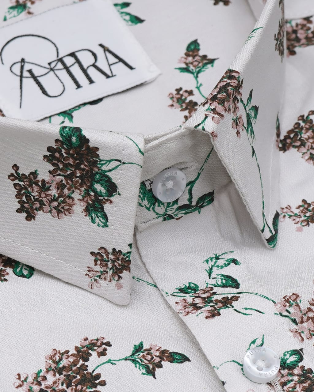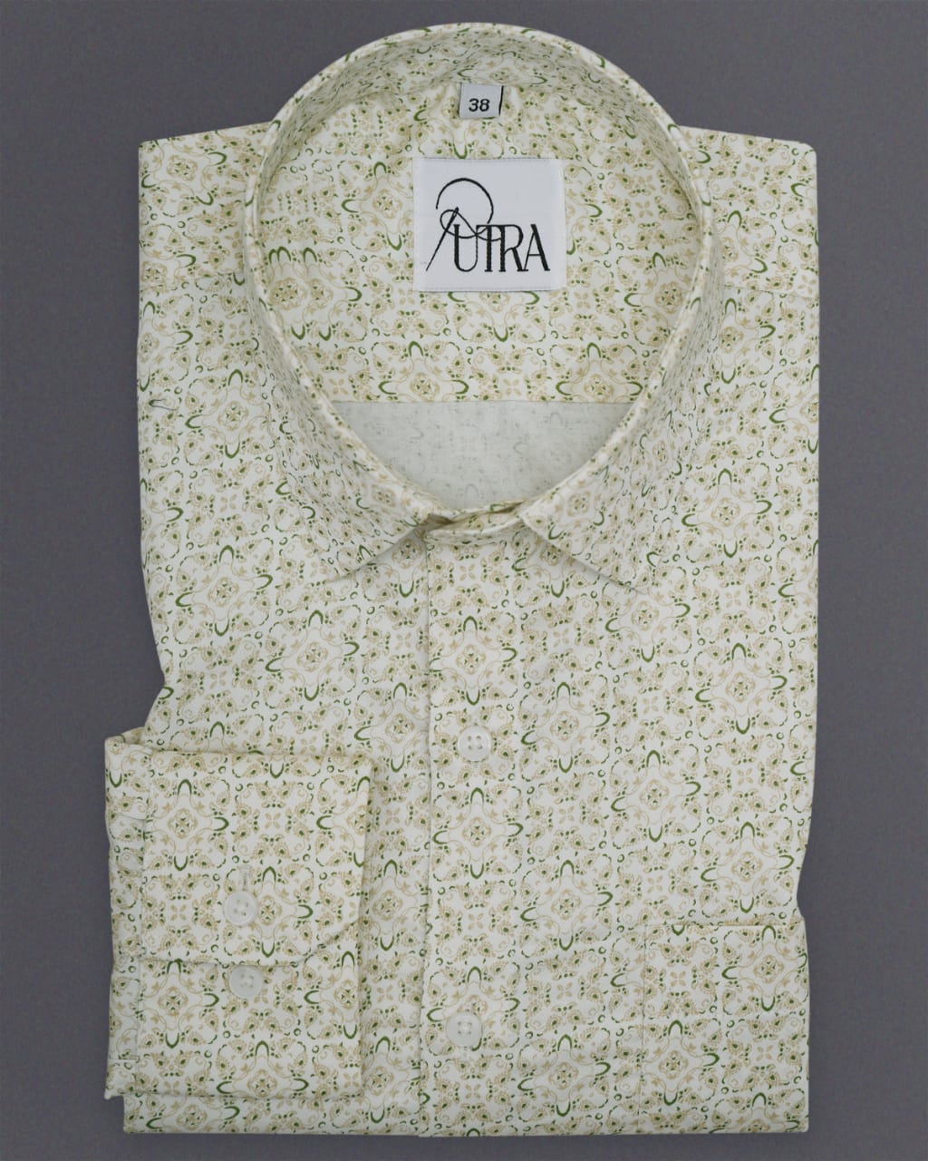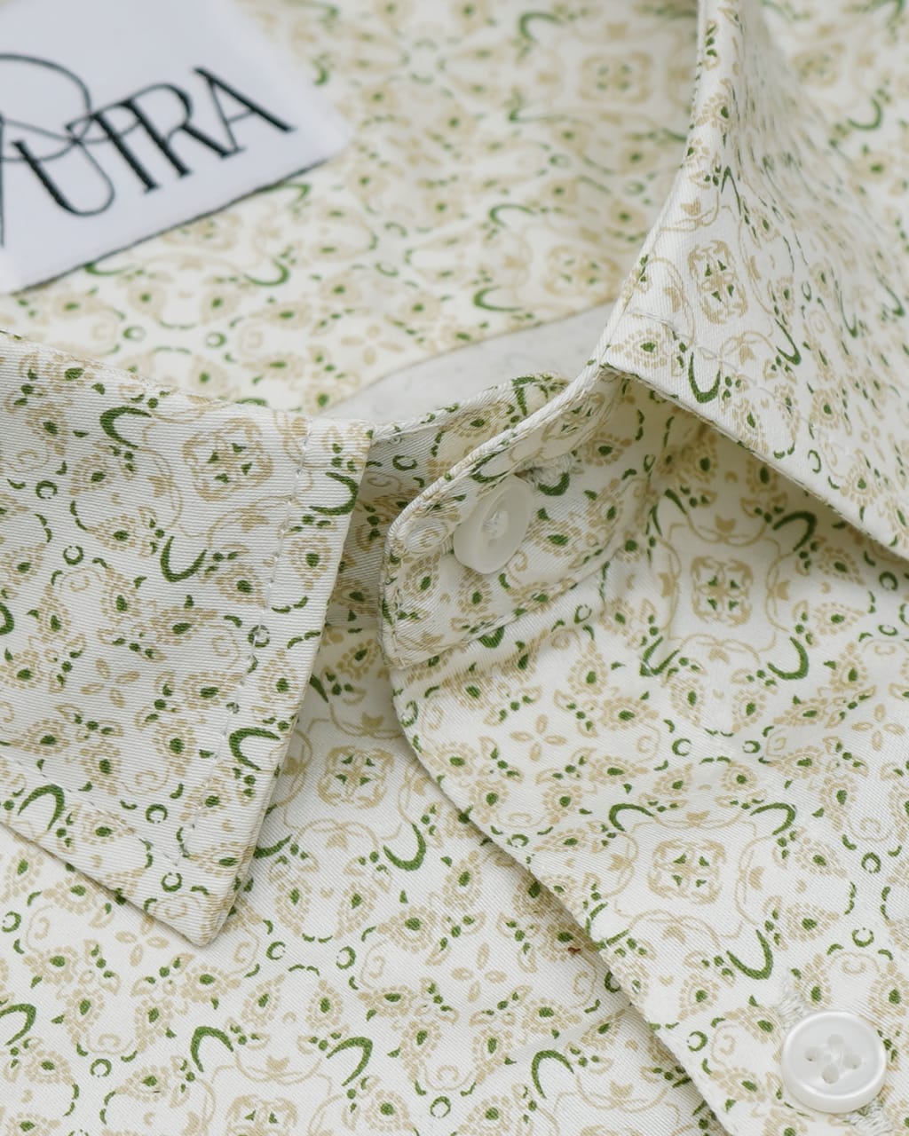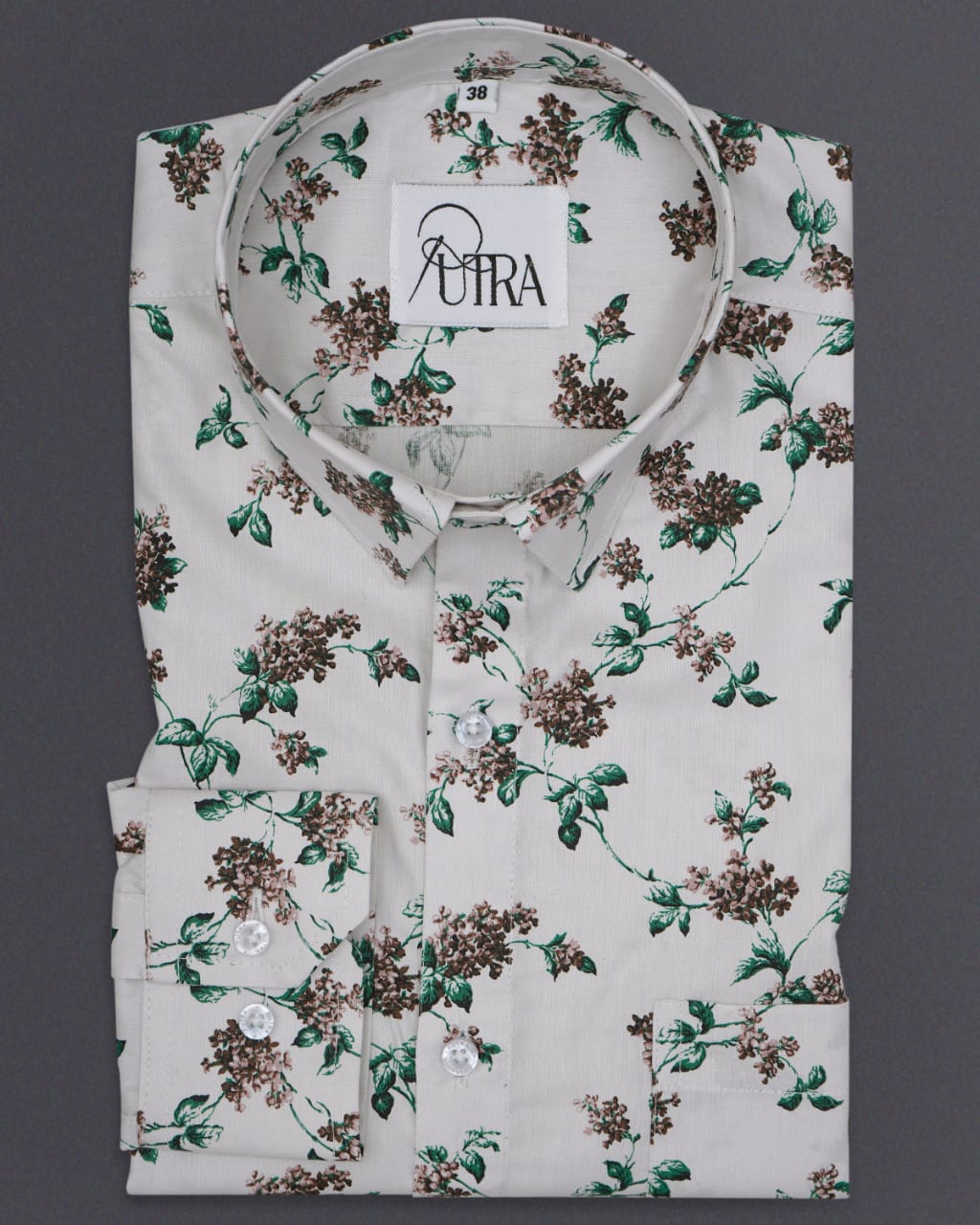 Floral Ivory Cotton Shirt with Green and Gold Accents