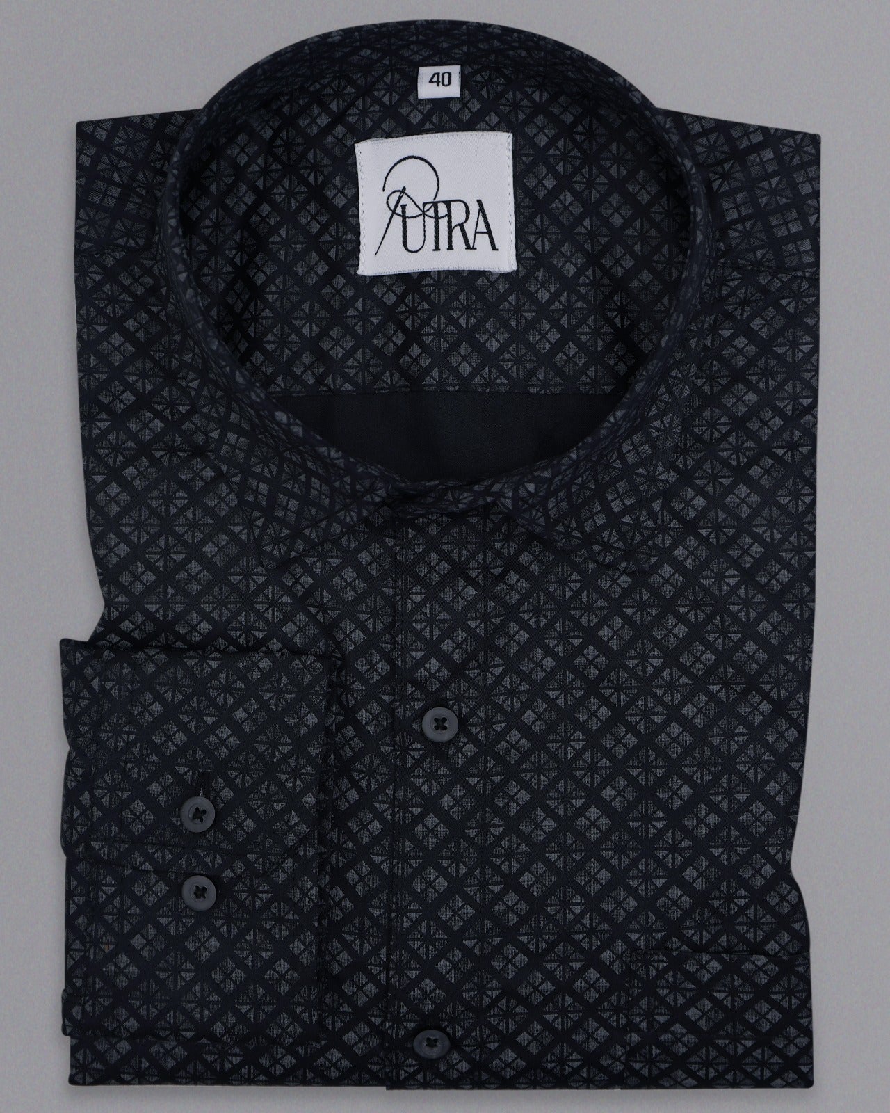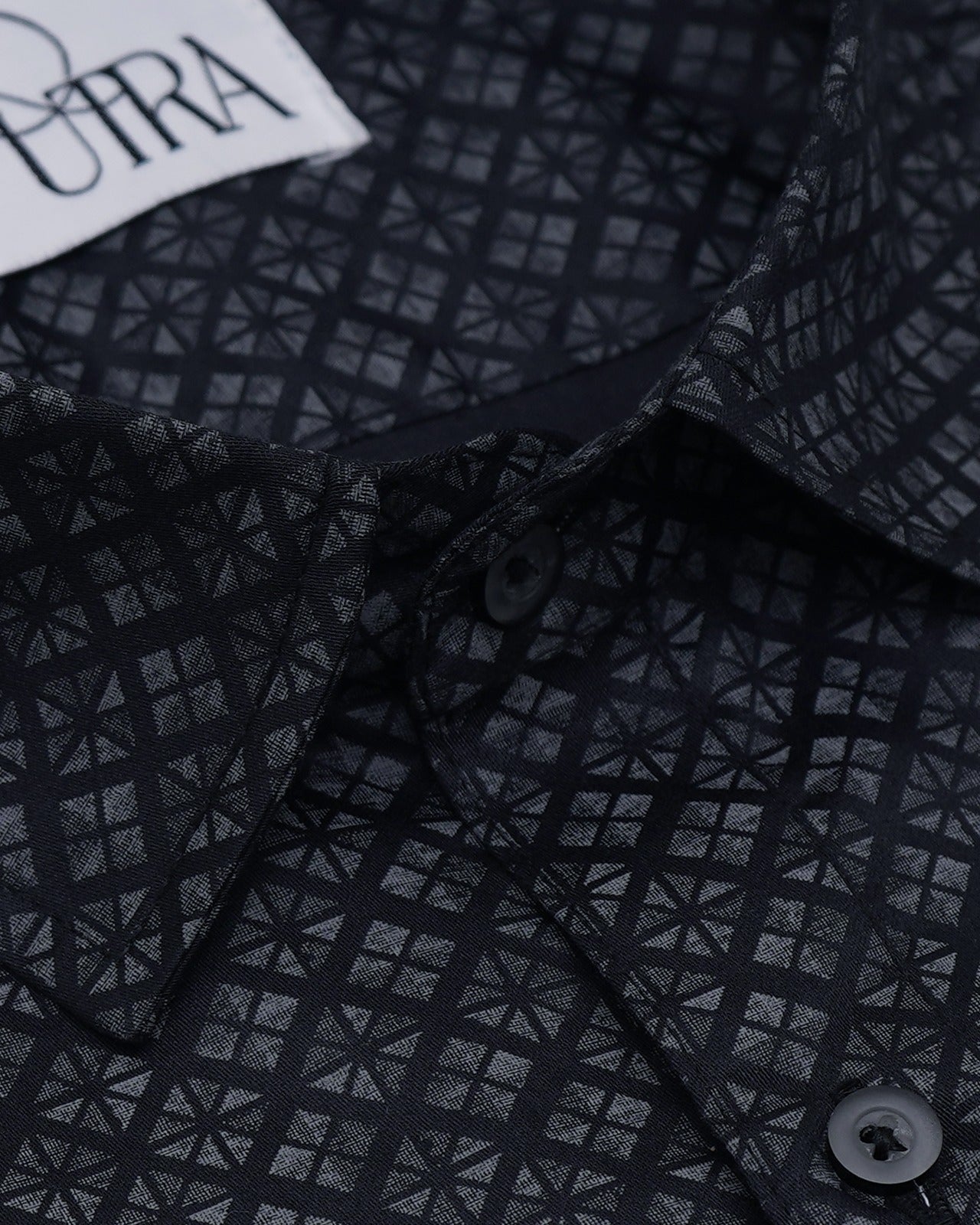 Elegant Black Geometric Cotton Shirt with Subtle Grey Accents